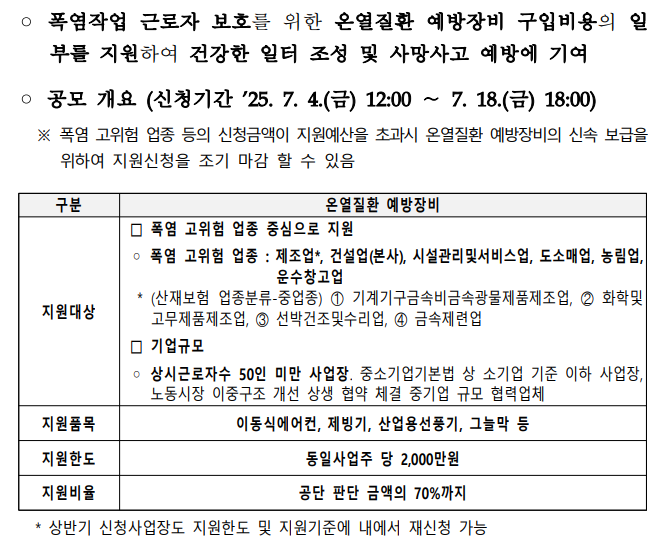[안전보건공단] 「2025년도 건강일터 조성지원 사업」 온열질환 예방장비 지원 사업(추경) 공고